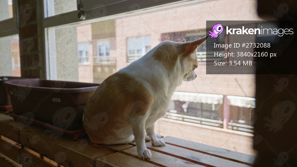 Chihuahua dog sitting indoors on wooden bench looking out window at urban building view.