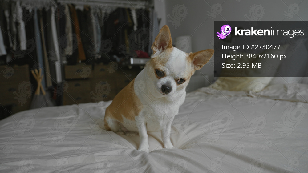 Chihuahua dog sitting on a plush bed in a cozy bedroom, showcasing a homey and serene atmosphere perfect for relaxation and comfort.