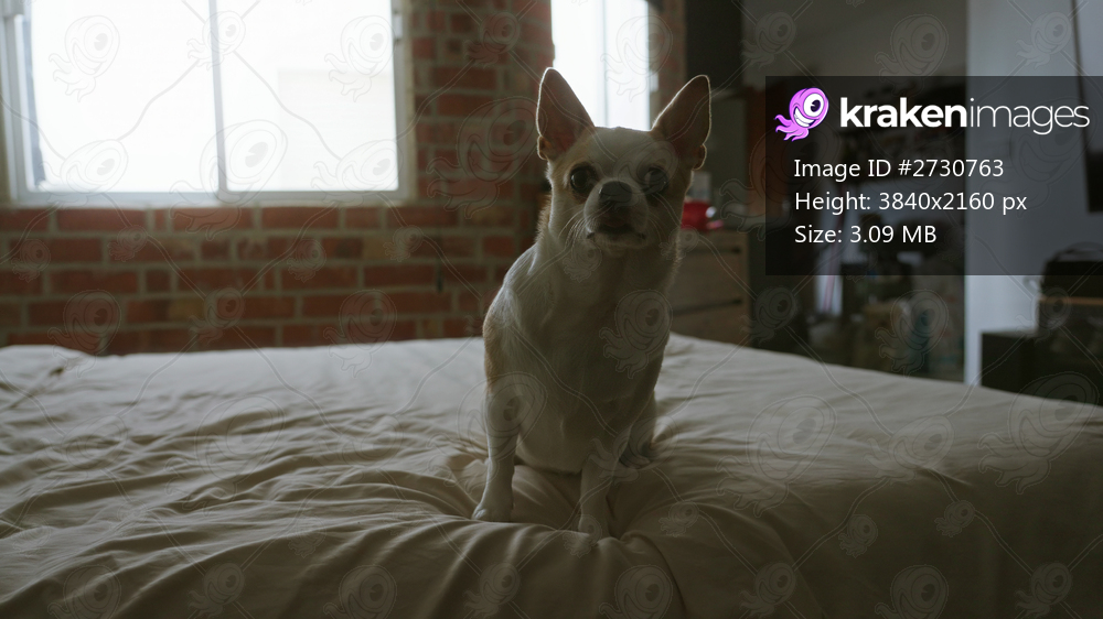 Chihuahua sitting on a bed in a cozy bedroom with a brick wall and sunlight filtering through a window, creating a warm and inviting home atmosphere.