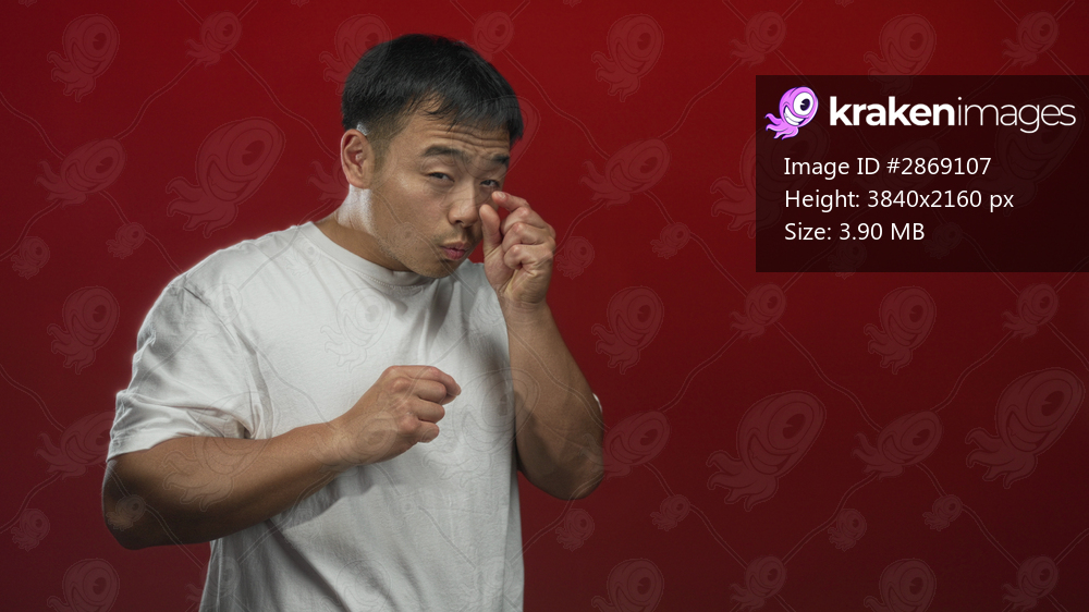 Chinese man pinches fingers in red studio wearing white shirt with determined gaze and focused expression; precision.