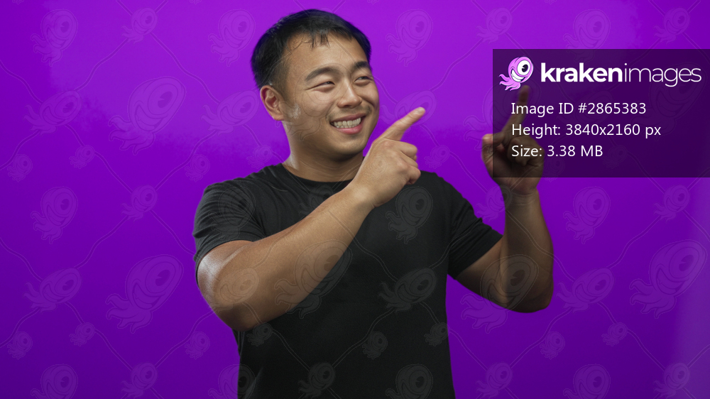 Chinese man smiling and pointing index finger to the right in purple studio; optimism hope positivity joy.