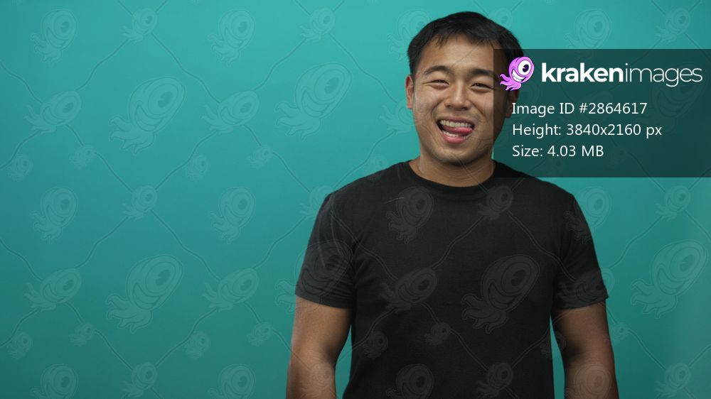 Chinese man wearing black t shirt sticks tongue out and winks at camera in teal studio setting; playfulness.