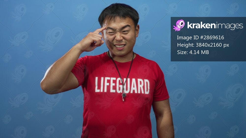 Chinese man wearing red lifeguard shirt pointing finger to head in a studio with blue backdrop; thinking idea.