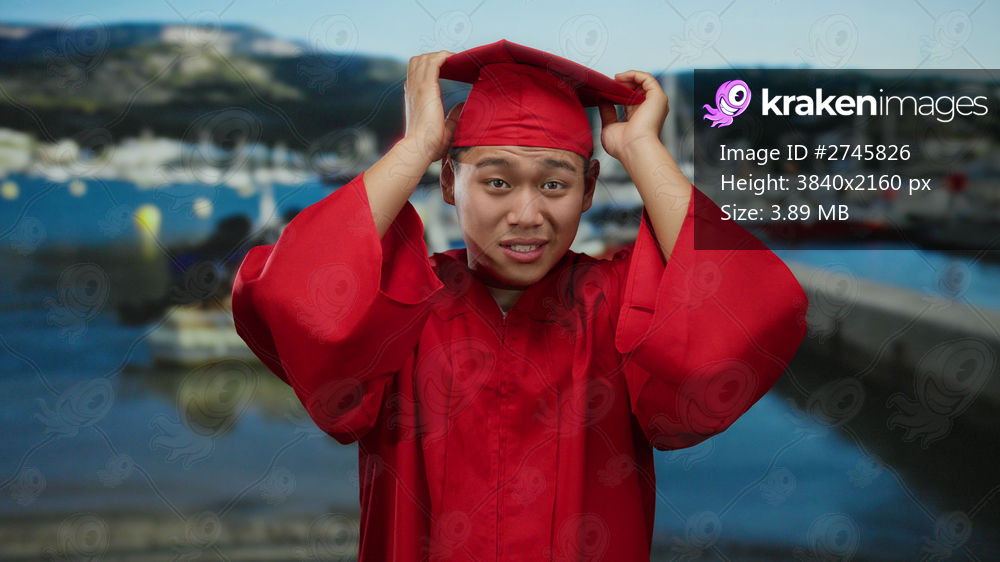 Chinese student in a red graduation gown gestures passionately by the seaside, set against a backdrop of boats and mountains under a clear sky, capturing a memorable moment. - Kraken Images