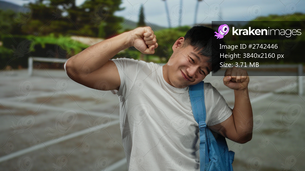 Chinese student stretches on outdoor tennis court, smiling with a blue backpack, embodying youthful energy and athletic setting.