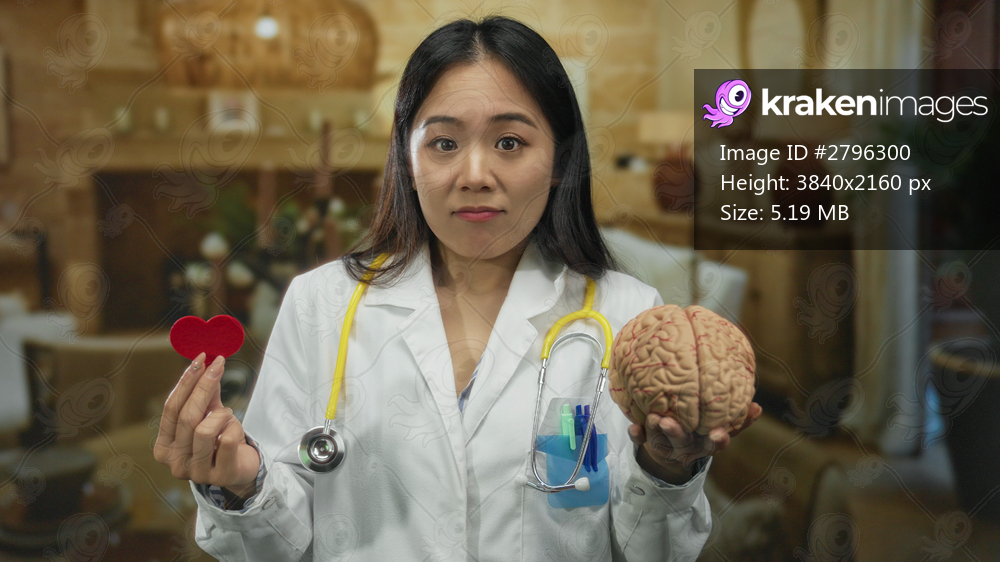 Chinese woman doctor holding brain and heart models, standing indoors with stethoscope in hotel room, showcasing medical knowledge and expertise in a casual setting. - Kraken Images