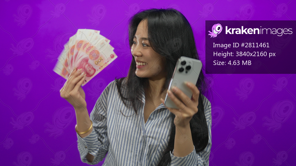 Chinese woman holding yuan banknotes and smartphone against a purple background, conveying a financial success theme