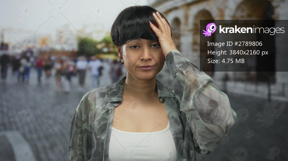 Chinese woman looking frustrated outdoors near the iconic roman colosseum with tourists in the background on a busy city street.