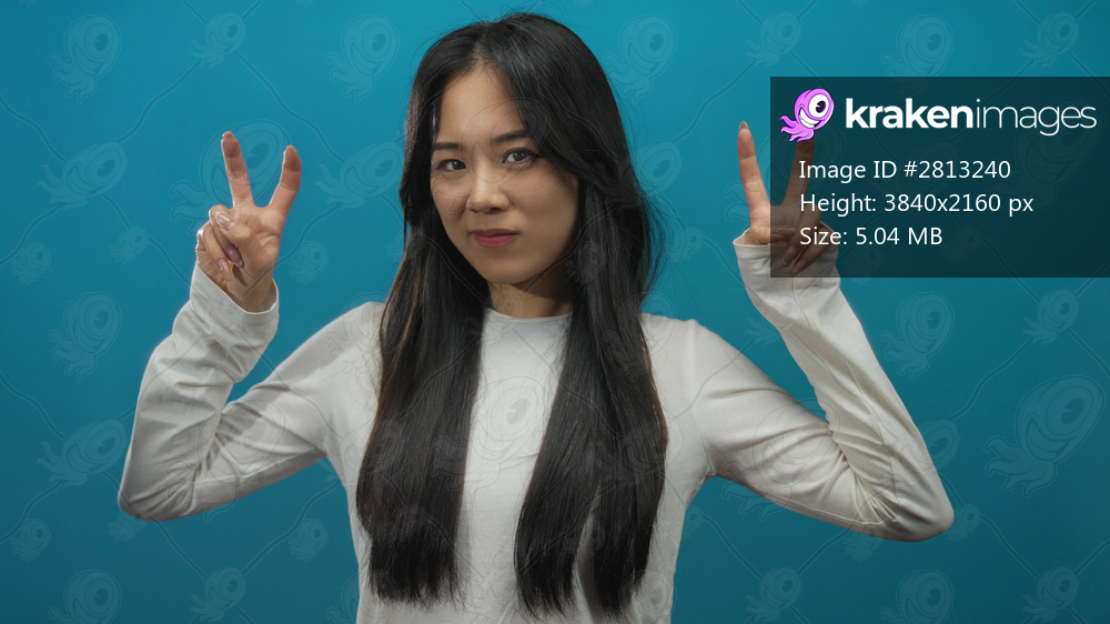 Chinese woman making quotation gesture over blue background, expressing concept or humor while wearing white top; youthful and confident expression.