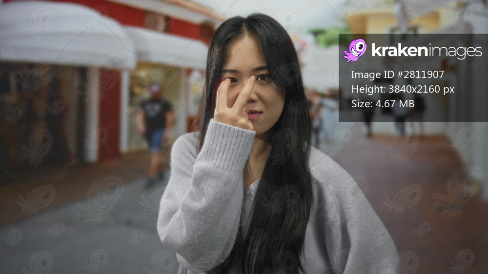 Chinese woman making watchful hand gesture on busy street in outdoor urban setting.