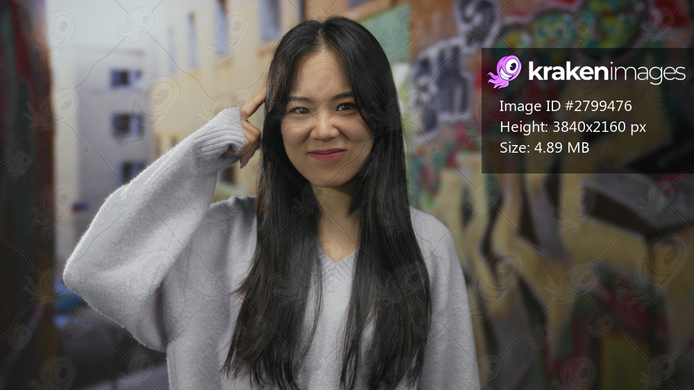 Chinese woman outdoors making a playful crazy gesture in front of colorful graffiti on an urban street, adding charm and humor to the vibrant city backdrop. - Kraken Images