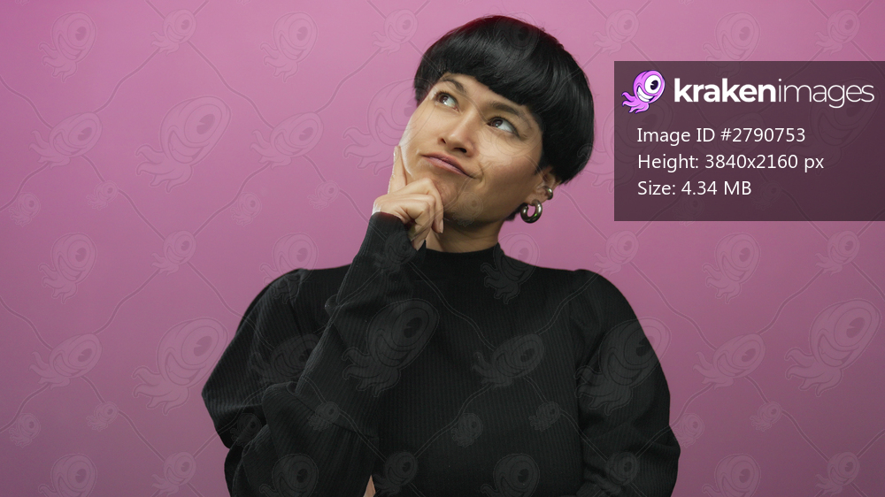Chinese woman pondering in black sweater against pink background, showcasing thoughtful expression and modern hairstyle in isolated portrait.