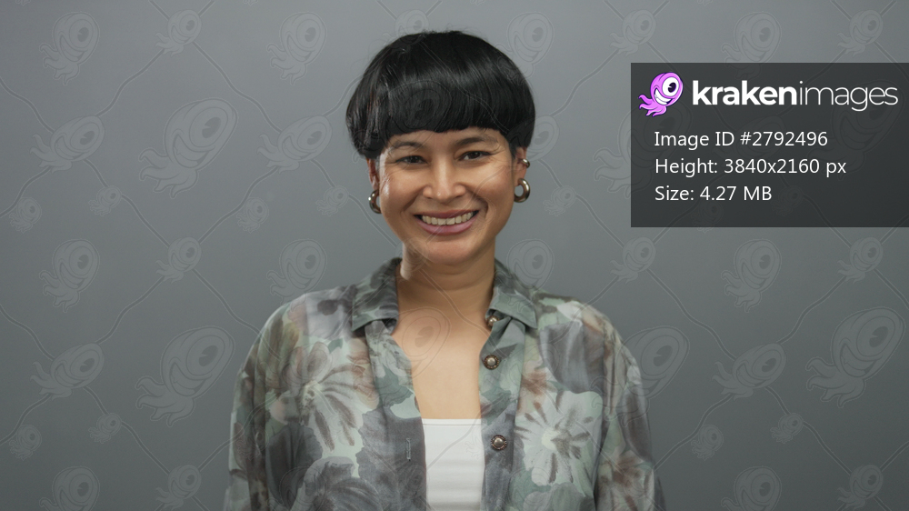 Chinese woman smiling making ok gesture in grey background showing positive emotion and confidence with isolated expression indicating approval.