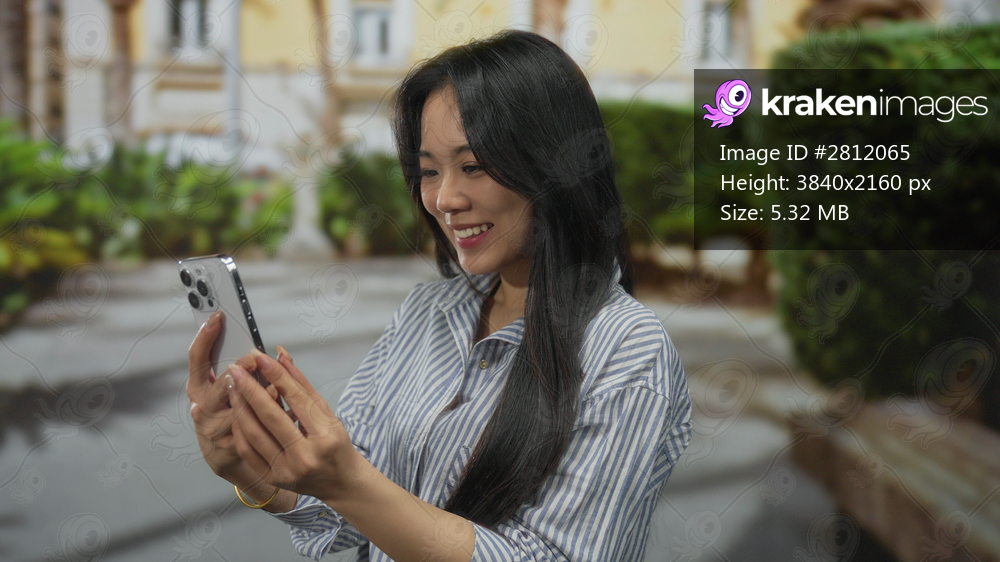 Chinese woman smiling on a street, holding smartphone outdoors, capturing a lively urban atmosphere.