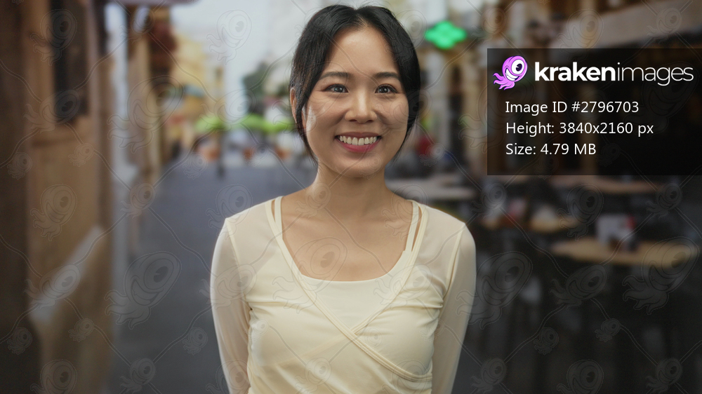 Chinese woman smiling outdoors on bustling street terrace in urban restaurant setting exuding happiness and positivity.