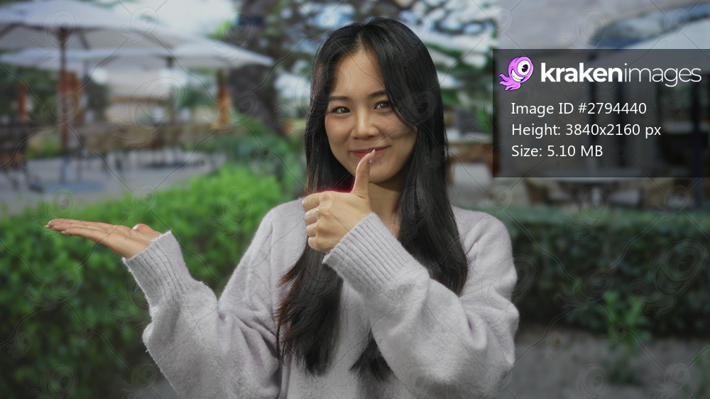 Chinese woman smiling with thumbs up gesture at outdoor restaurant with green garden and umbrella-covered tables on terrace.