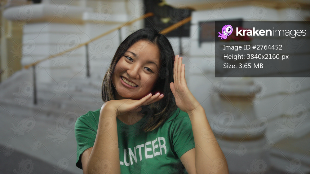 Chinese woman volunteer with green t-shirt posing playfully outdoors on a city street, smiling cheerfully with hands framing her face against a backdrop of white building. - Kraken Images