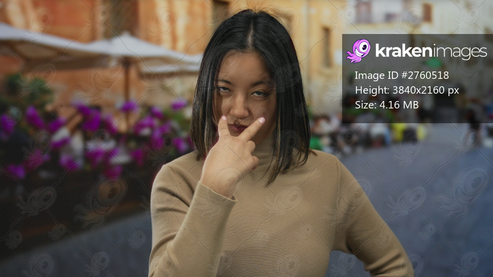 Chinese young woman gesturing while standing on an outdoor restaurant terrace in a bustling city street setting.