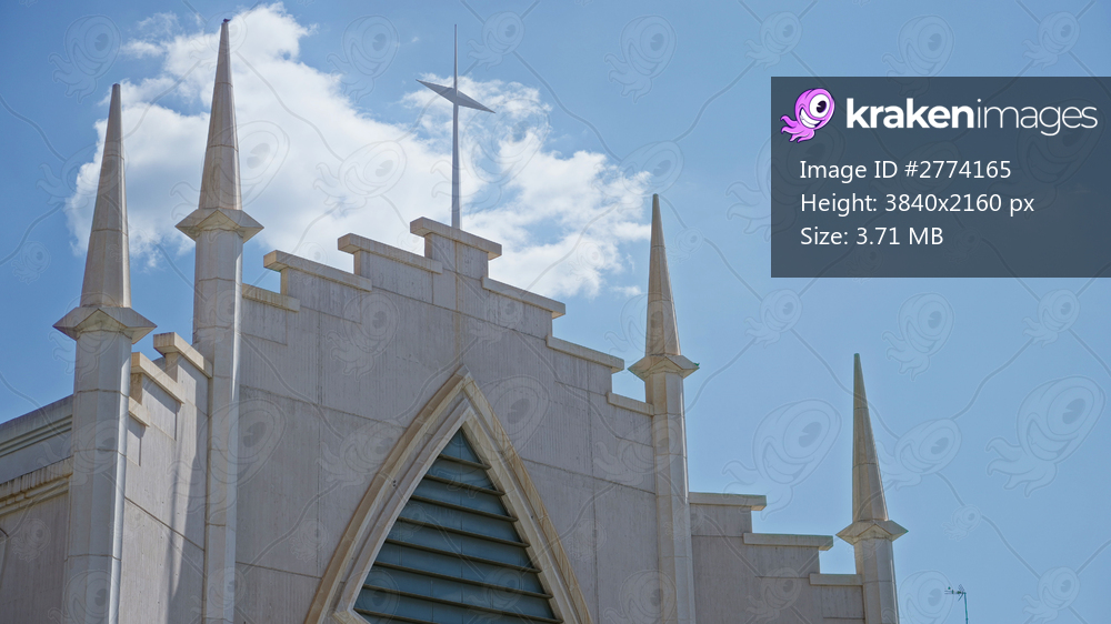 Church facade with pointed architecture under a blue sky in torrevieja, showcasing religious exterior design against fluffy clouds.