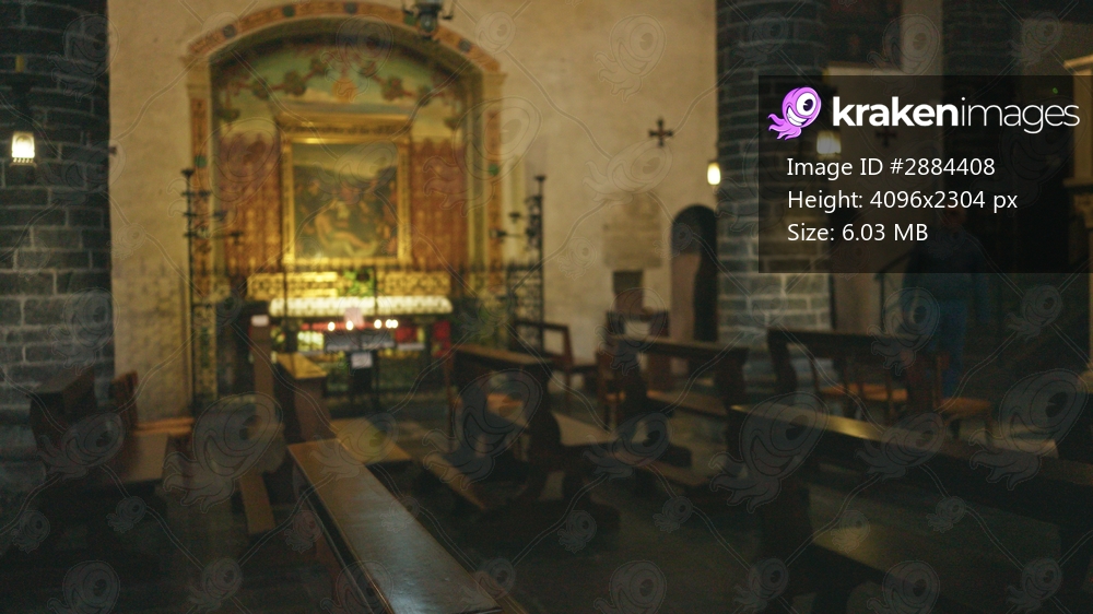 Church interior with defocused altar, wooden pews and stone pillars in shallow bokeh; background, backplate, copyspace, calm.