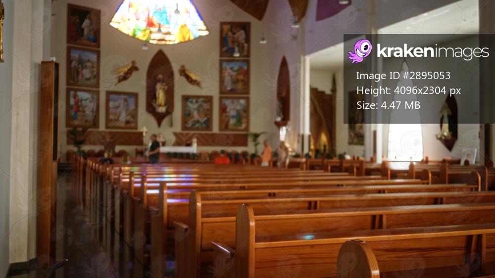 Church interior with shallow focus on wooden pews and defocused stained glass altar in the background; background backplate calm.