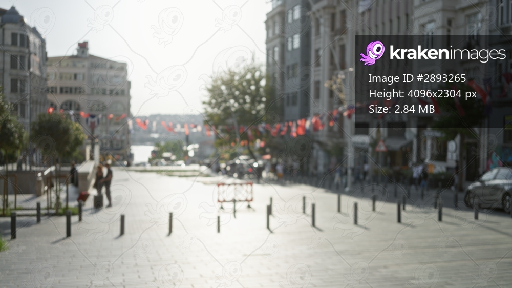 City street blurred bokeh background with sunlit flags, distant waterfront and soft architectural facades; backdrop copyspace backplate calm.