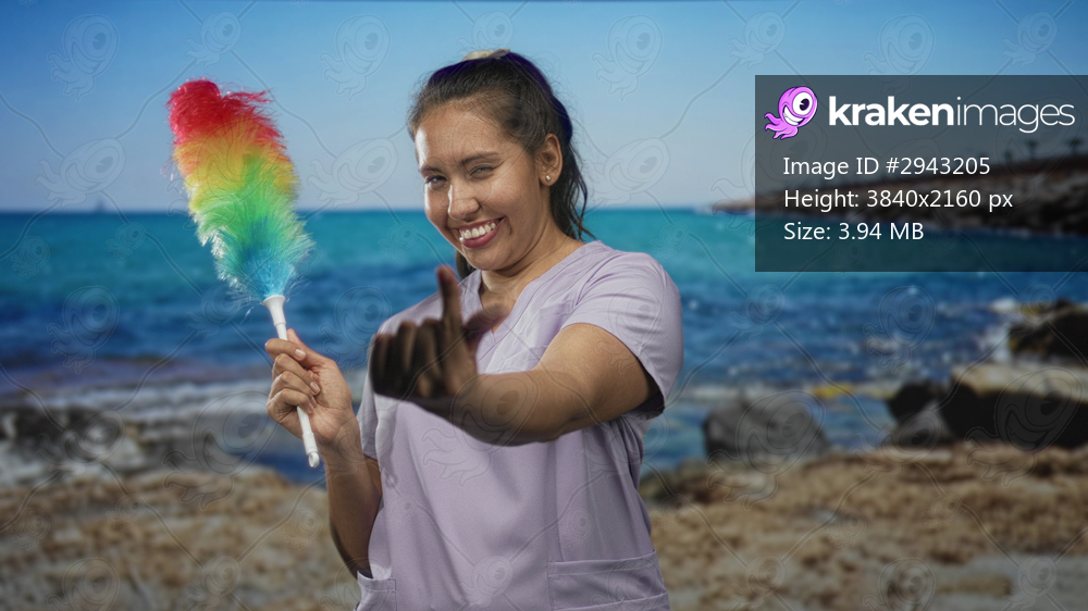 Cleaner woman wearing scrubs holding rainbow duster beckons with finger at rocky seaside shore; playful invitation care.