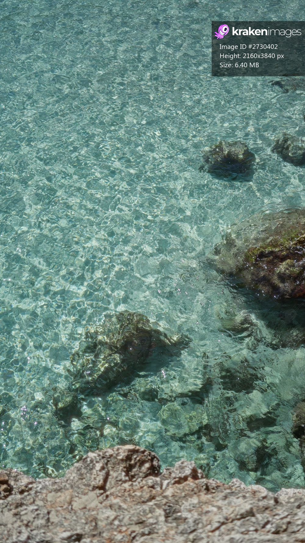 Clear turquoise water gently laps over rocky shoreline in idyllic mallorca beach setting under bright sunlight.