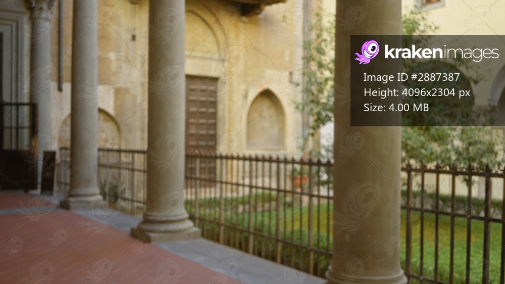 Cloister courtyard of a historic building with stone columns in soft defocused blur church; background backplate copyspace calm.