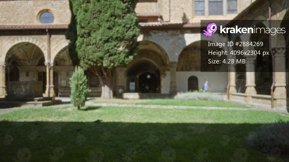 Cloister courtyard softly defocused church with arched arcades, cypress tree and central lawn; background backdrop copyspace calm.