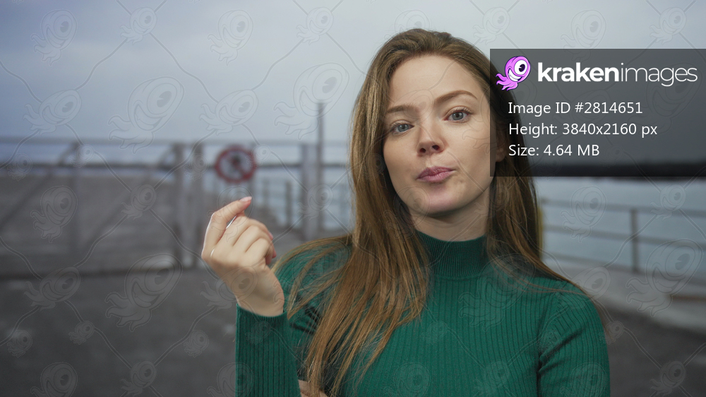 Closeup woman flips hair with hand near face on street by seaside railing under overcast sky; quiet confidence.