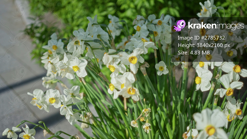 Clusters of white and yellow narcissus flowers bloom vibrantly outdoors in a sunny netherlands garden, showcasing lush green foliage and a clear blue sky. - Kraken Images