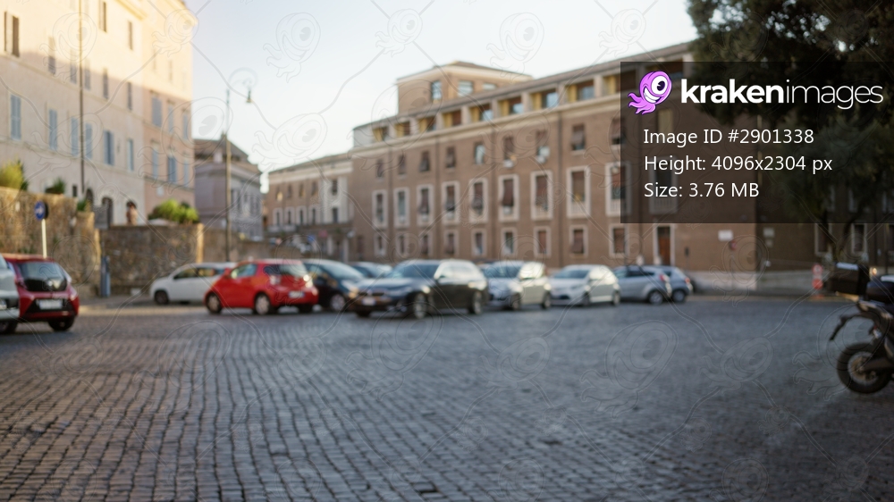 Cobblestone city square defocused background with parked cars and historic facades, soft shallow focus; background backdrop copyspace calm.