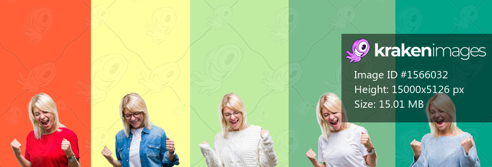 Collage of beautiful blonde woman over vivid vintage isolated background very happy and excited doing winner gesture with arms raised, smiling and screaming for success. Celebration concept. - Kraken Images