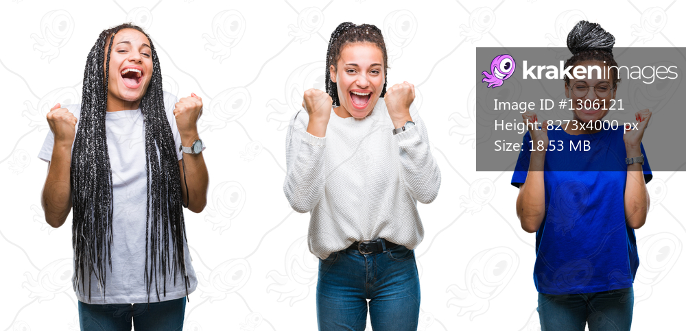 Collage of beautiful braided hair african american woman over isolated background celebrating surprised and amazed for success with arms raised and open eyes. Winner concept. - Kraken Images