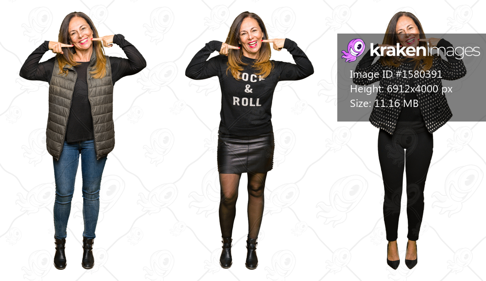 Collage of beautiful and fashion middle age woman over white isolated background smiling confident showing and pointing with fingers teeth and mouth. Health concept. - Kraken Images