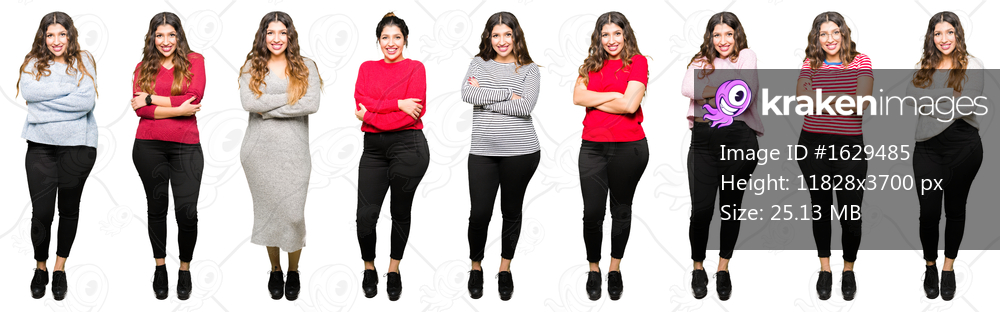 Collage of beautiful young woman wearing different looks over white isolated background happy face smiling with crossed arms looking at the camera. Positive person. - Kraken Images