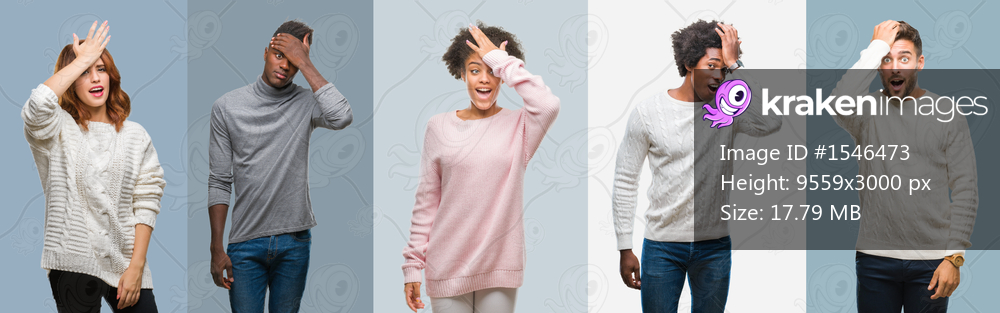 Collage of group of african american and hispanic people wearing winter sweater over vintage background surprised with hand on head for mistake, remember error. Forgot, bad memory concept. - Kraken Images