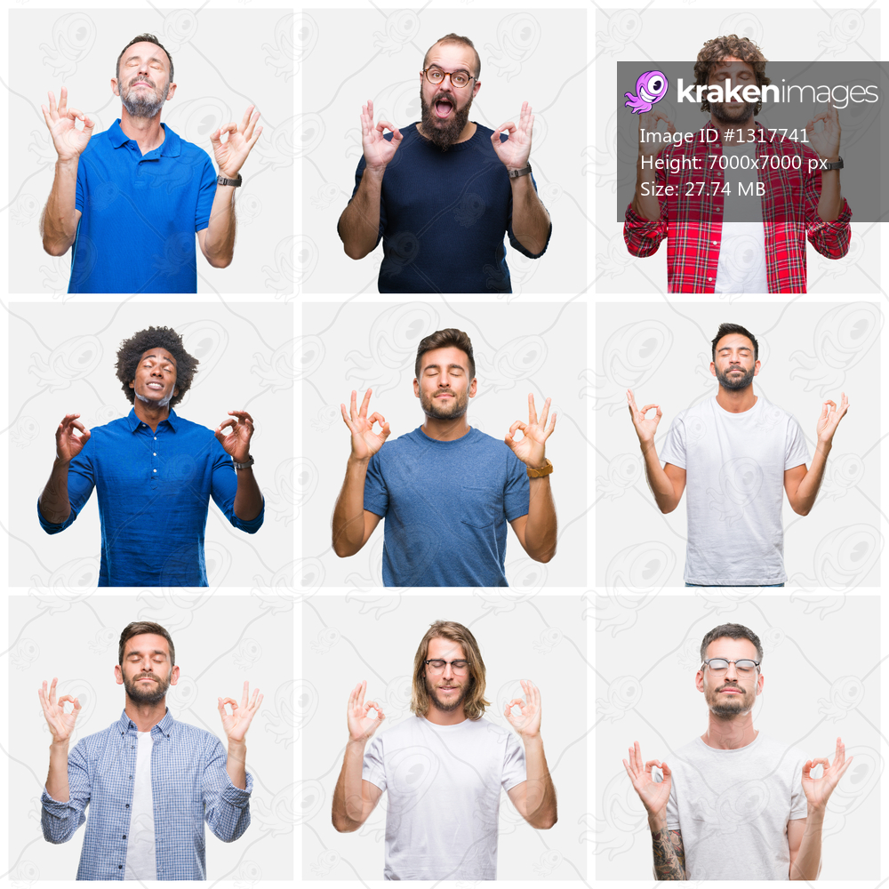 Collage of group of men over white isolated background relax and smiling with eyes closed doing meditation gesture with fingers. Yoga concept.