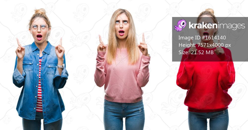 Collage of young beautiful blonde woman over isolated background amazed and surprised looking up and pointing with fingers and raised arms.