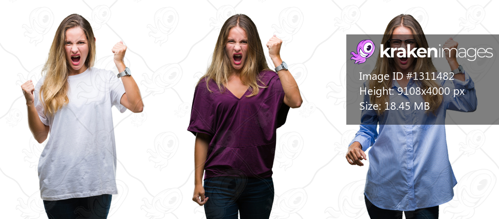 Collage of young beautiful blonde woman over isolated background angry and mad raising fist frustrated and furious while shouting with anger. Rage and aggressive concept. - Kraken Images