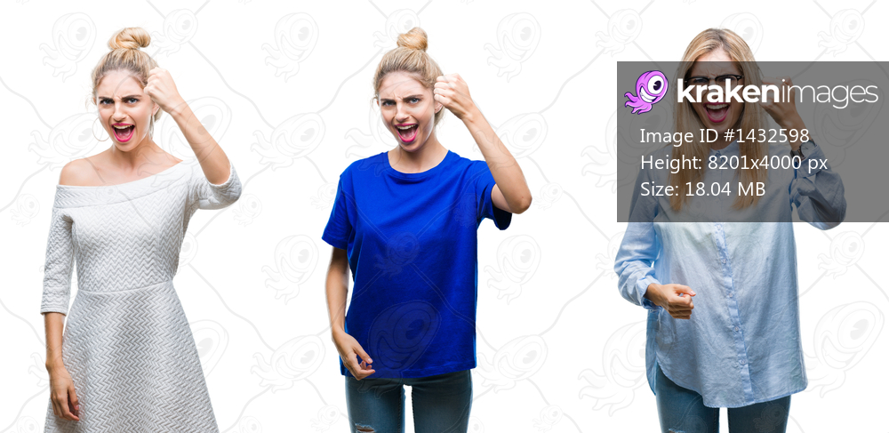 Collage of young beautiful blonde woman over isolated background angry and mad raising fist frustrated and furious while shouting with anger. Rage and aggressive concept. - Kraken Images