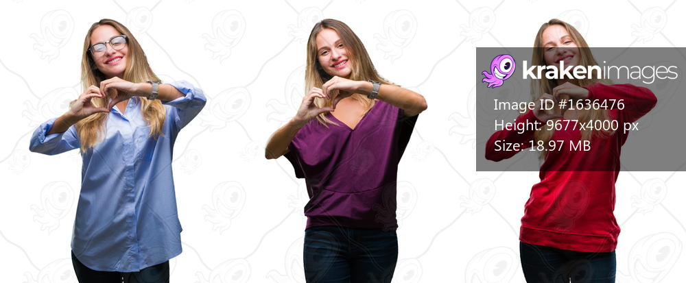 Collage of young beautiful blonde woman over isolated background smiling in love showing heart symbol and shape with hands. Romantic concept.