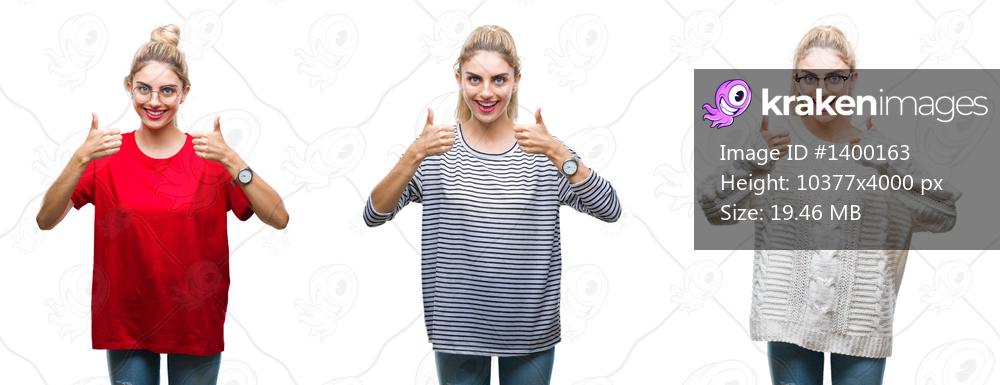 Collage of young beautiful blonde woman over isolated background success sign doing positive gesture with hand, thumbs up smiling and happy. Looking at the camera with cheerful expression, winner gesture. - Kraken Images