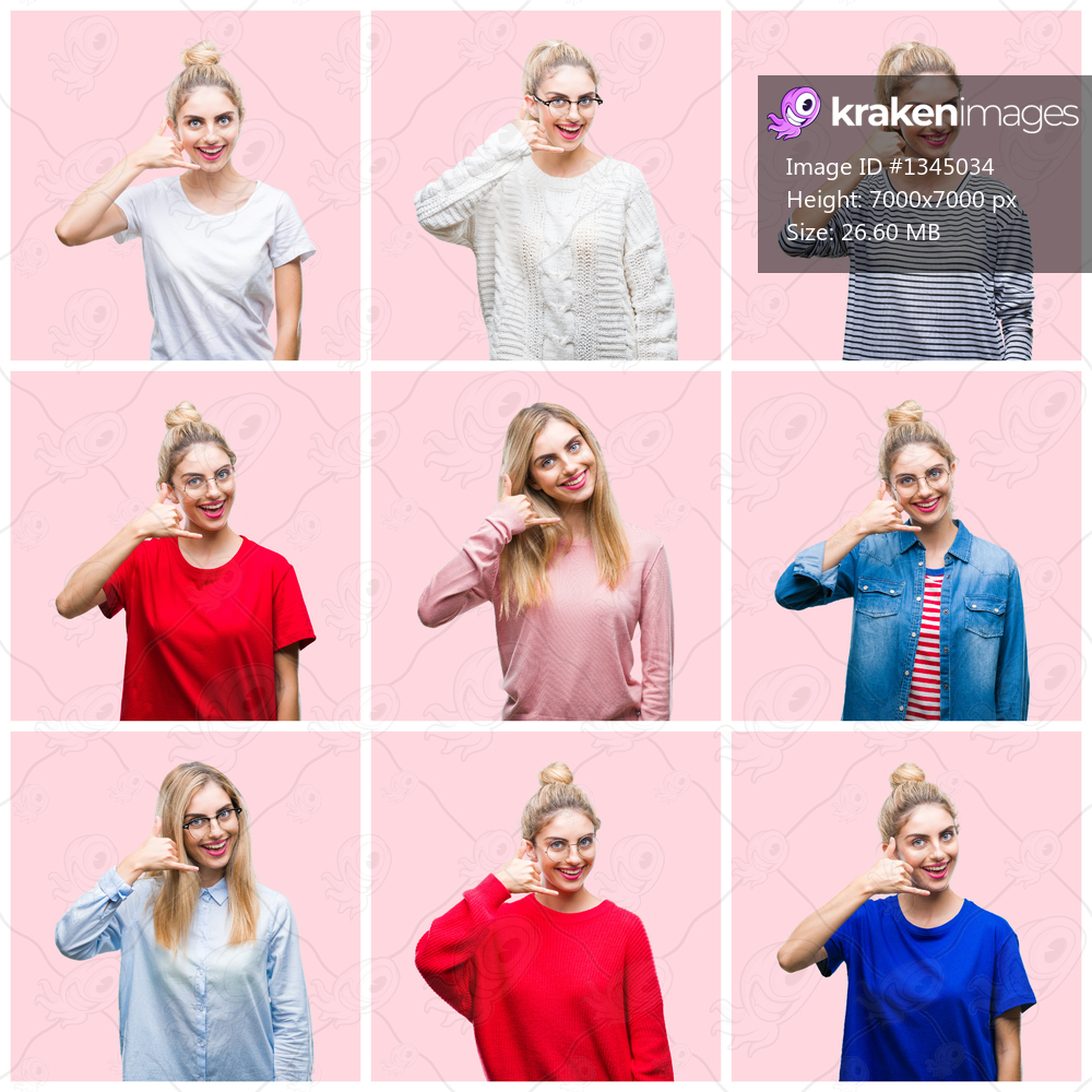 Collage of young beautiful blonde woman over pink isolated background smiling doing phone gesture with hand and fingers like talking on the telephone. Communicating concepts. - Kraken Images
