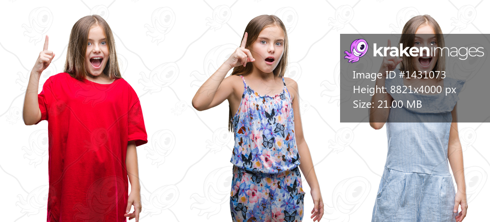 Collage of young beautiful little girl kid over isolated background pointing finger up with successful idea. Exited and happy. Number one.