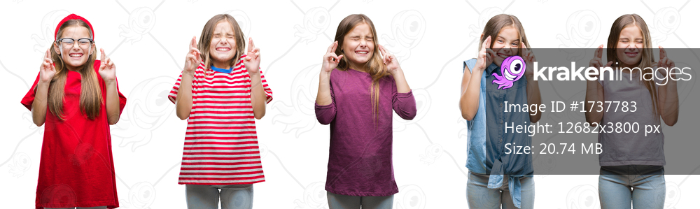 Collage of young beautiful little girl kid over isolated background smiling crossing fingers with hope and eyes closed. Luck and superstitious concept. - Kraken Images