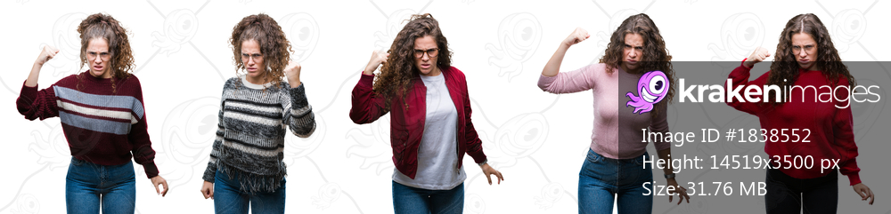 Collage of young brunette curly hair girl over isolated background angry and mad raising fist frustrated and furious while shouting with anger. Rage and aggressive concept. - Kraken Images