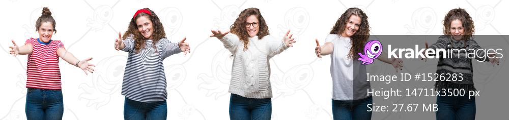 Collage of young brunette curly hair girl over isolated background looking at the camera smiling with open arms for hug. Cheerful expression embracing happiness. - Kraken Images