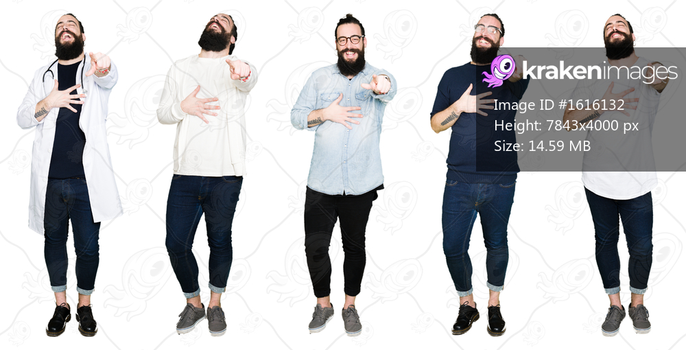 Collage of young man with beard and long hair over white isolated background Laughing of you, pointing to the camera with finger hand over chest, shame expression - Kraken Images